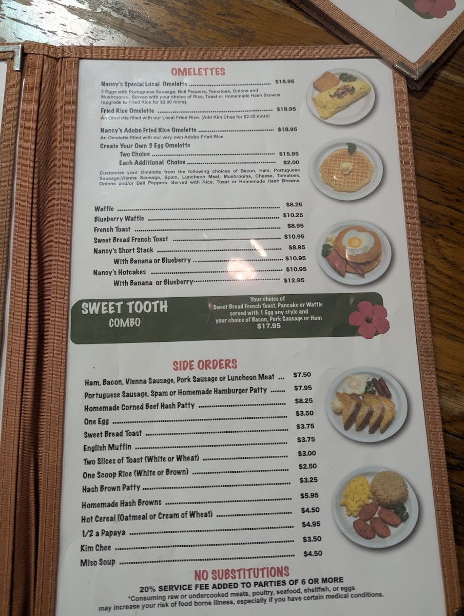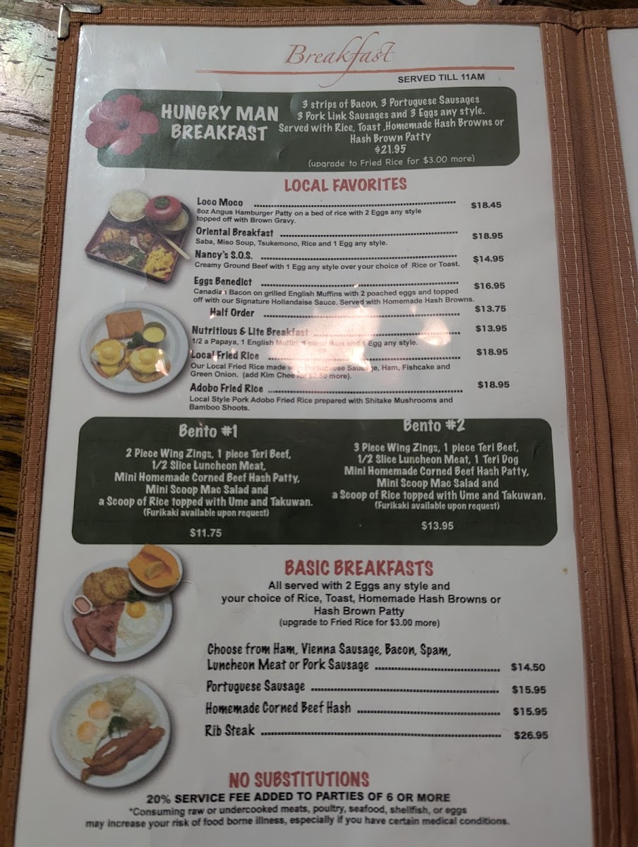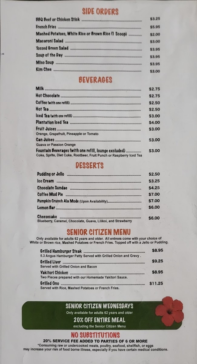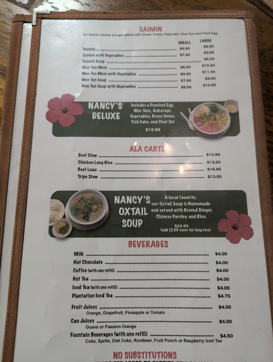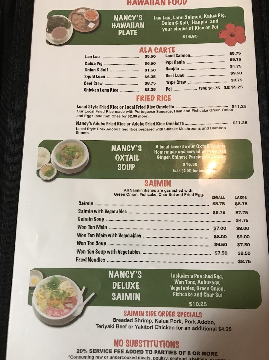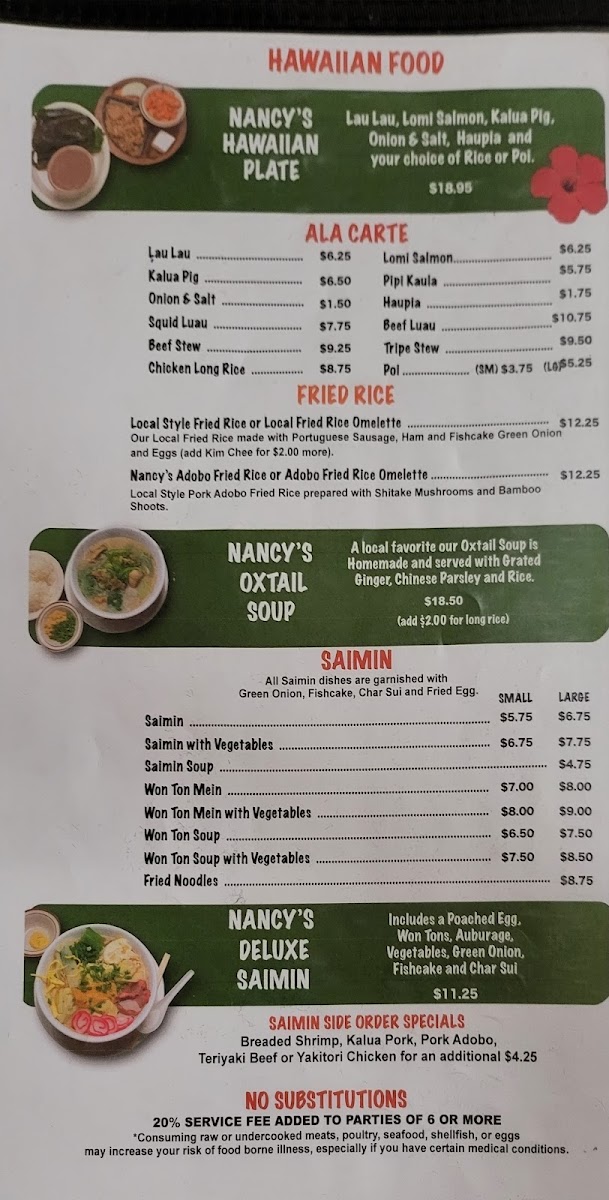 As a final takeaway from my experience reviewing the menu at Nancy's Kitchen located at 94-1040 Waipio Uka St #14, Waipahu, HI 96797, the selection reflects a comforting balance between local Hawaiian flavors and familiar, satisfying classics. The menu may not be overly long, but it is thoughtfully curated, giving diners a clear sense of what the kitchen does best. Starting with the salad options like Tuns Salad and Chef Salad, the restaurant offers lighter choices that still feel hearty and practical. Moving into traditional island fare, Nancy's Hawaiian Plate stands out as a centerpiece that represents the soul of local Hawaiian cooking. For those craving something filling and flavorful, the fried rice section delivers variety with Local Style Fried Rice and the more indulgent Adobo Fried Rice Omelette, both highlighting bold, savory notes. Noodle lovers are well taken care of with comforting bowls such as Large Saimin Soup and Large Fried Noodles, which feel ideal for a warm, satisfying meal. The signature Nancy's Deluxe Saimin elevates this category further, clearly positioned as a house specialty. To round out the menu, the deli sandwiches-especially the Turkey "Thunder" Sandwich and Tuna Salad Sandwich-provide quick, familiar options that still align with the restaurant’s overall comfort-food identity. Taken together, the menu at Nancy’s Kitchen feels cohesive, approachable, and rooted in local taste, making it easy to see why it appeals to both regulars and first-time visitors looking for an authentic, no-frills dining experience in Waipahu.